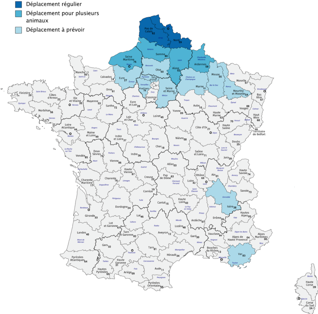 • En bleu moyen : département où j’effectue des déplacements pour plusieurs animaux,